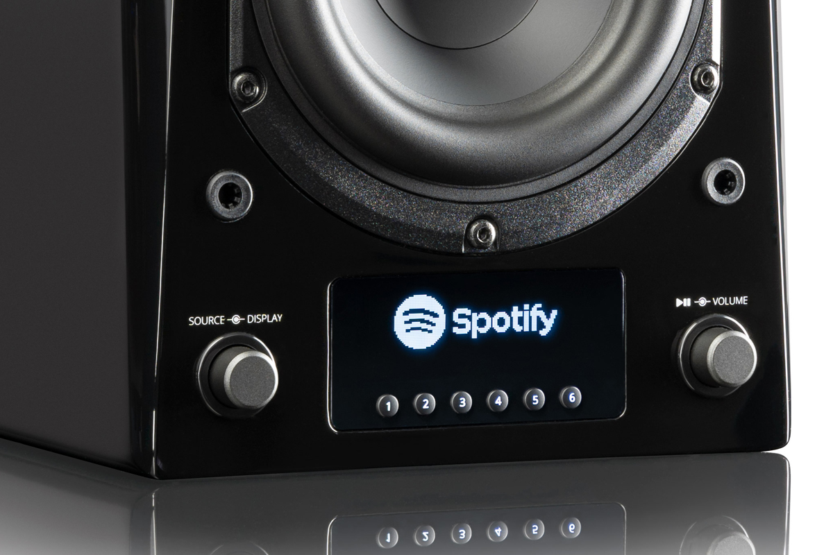 Each enclosure measures 11.5″H × 7″W × 9″D. The primary speaker weighs 12.3 pounds and the secondary speaker weighs 11.7 pounds. The grilles cover all but the bottom 2″ of the front baffle. On the right speaker, this area is occupied by a control panel with rotary knobs on either side, and in the middle, a 3″ OLED display that shows track metadata, volume, and selected source. Push the knob on the left to turn the display on and off; rotate it to cycle through sources. Push the knob on the right to pause and resume playback, rotate it to adjust volume. Below the screen are six illuminated pushbuttons that function like car-radio presets. You can program any button to play a favorite internet radio station or playlist by pressing and holding it while the desired content is playing. Nice and simple.